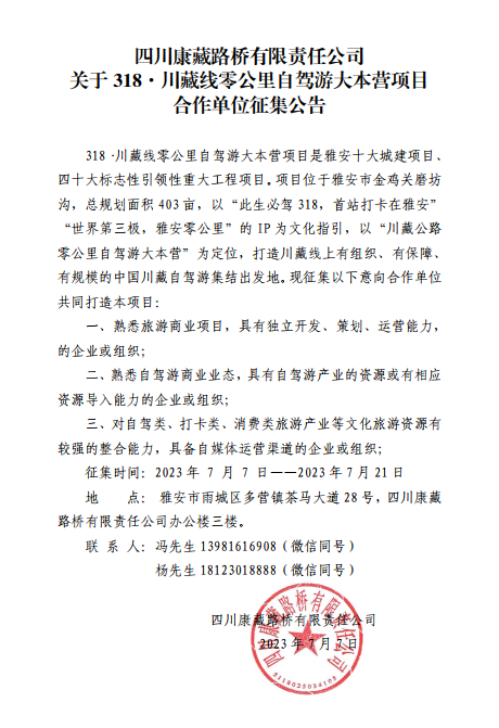 四川康藏路橋有限責(zé)任公司關(guān)于318.自駕大本營(yíng)合作單位征集公告