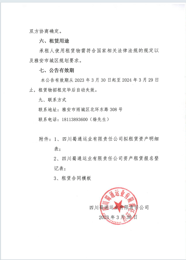 蜀通運(yùn)業(yè)有限責(zé)任公司關(guān)于閑置資產(chǎn)公開招租的公告附件