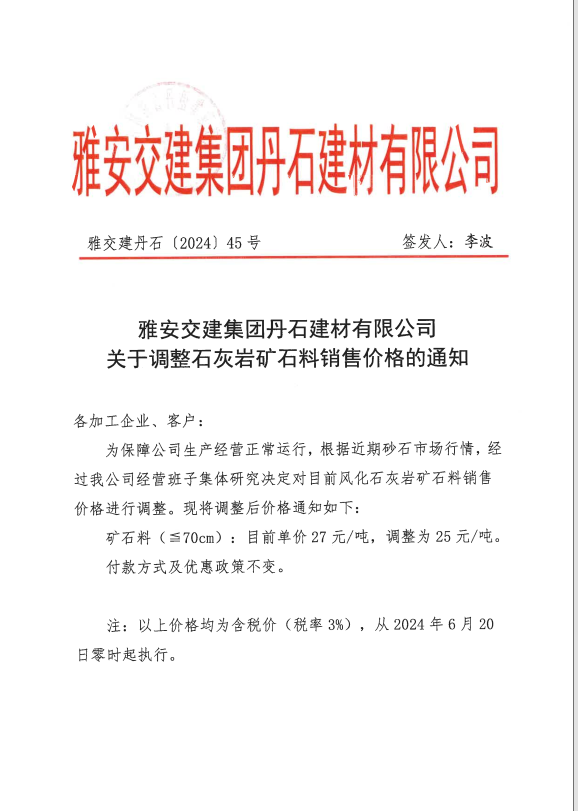 關于調整石灰?guī)r礦石料銷售價格的通知