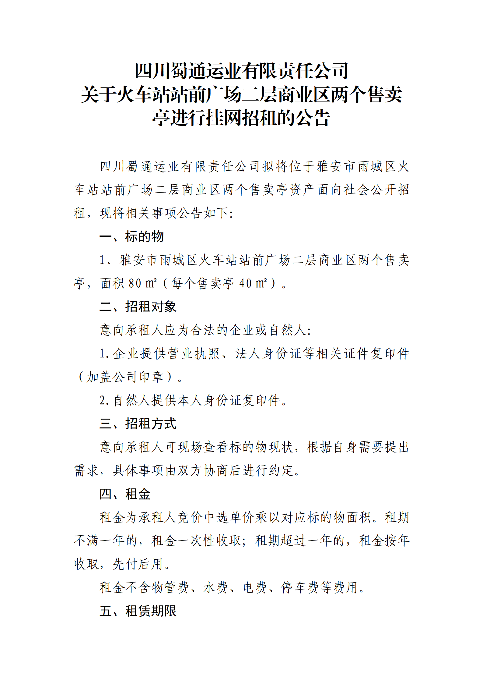 四川蜀通運(yùn)業(yè)有限責(zé)任公司關(guān)于火車站站前廣場二層商業(yè)區(qū)兩個售賣亭進(jìn)行掛網(wǎng)招租的公告