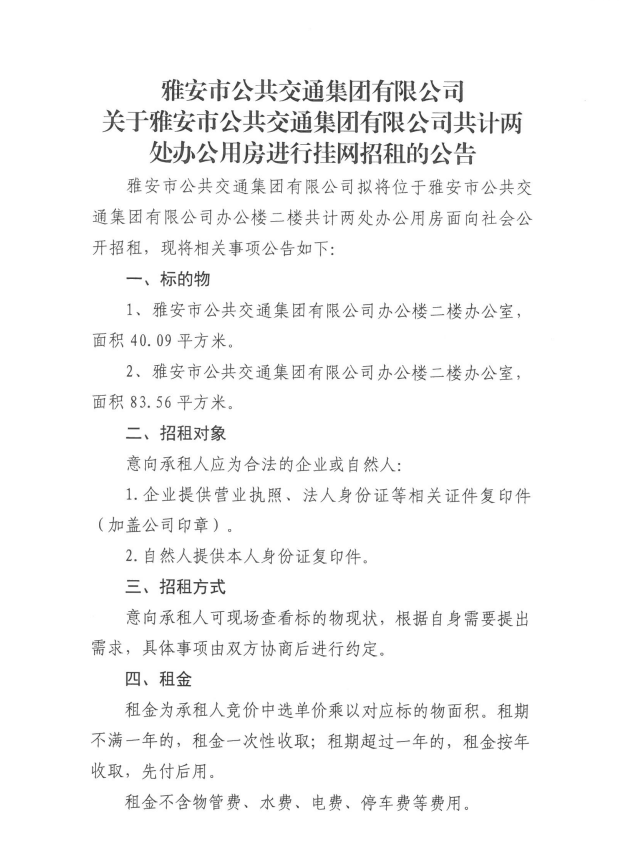 關(guān)于雅安市公共交通集團(tuán)有限公司共計(jì)兩處辦公用房進(jìn)行掛網(wǎng)招租的公告