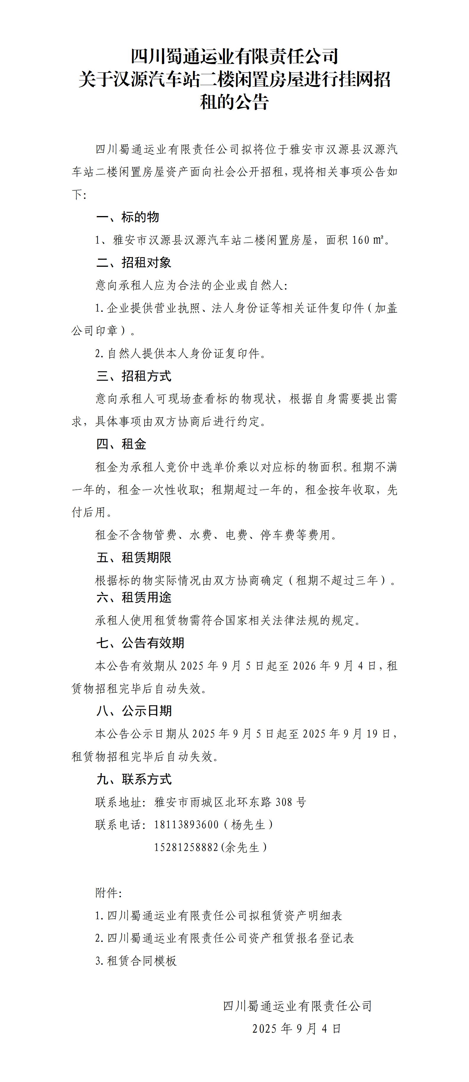 四川蜀通運(yùn)業(yè)有限責(zé)任公司 關(guān)于漢源汽車站二樓閑置房屋進(jìn)行掛網(wǎng)招租的公告