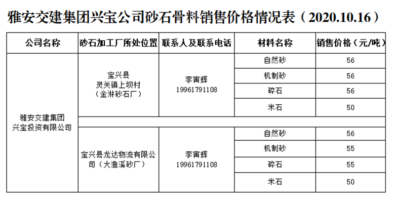 雅安交建集團興寶公司砂石骨料銷售價格情況表(2020.10.16)