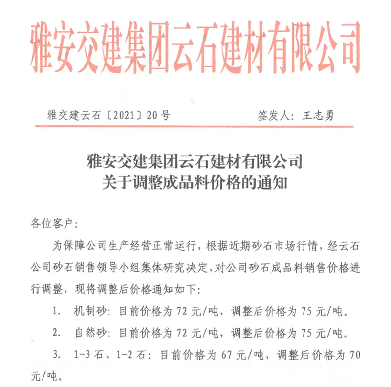 雅安交建集團(tuán)云石公司砂石骨料銷售價格情況表(2021.6.20)