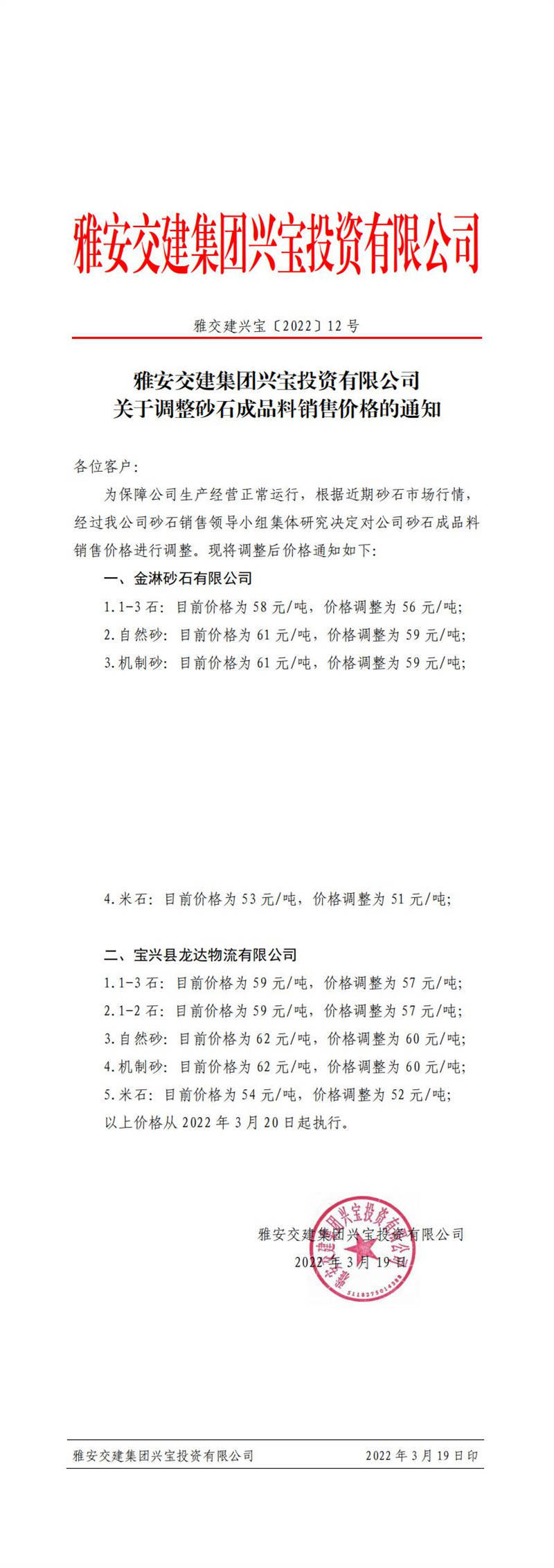 雅交建興寶〔2022〕12號 關于調(diào)整砂石成品料銷售價格的通知3月19日
