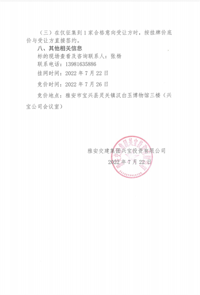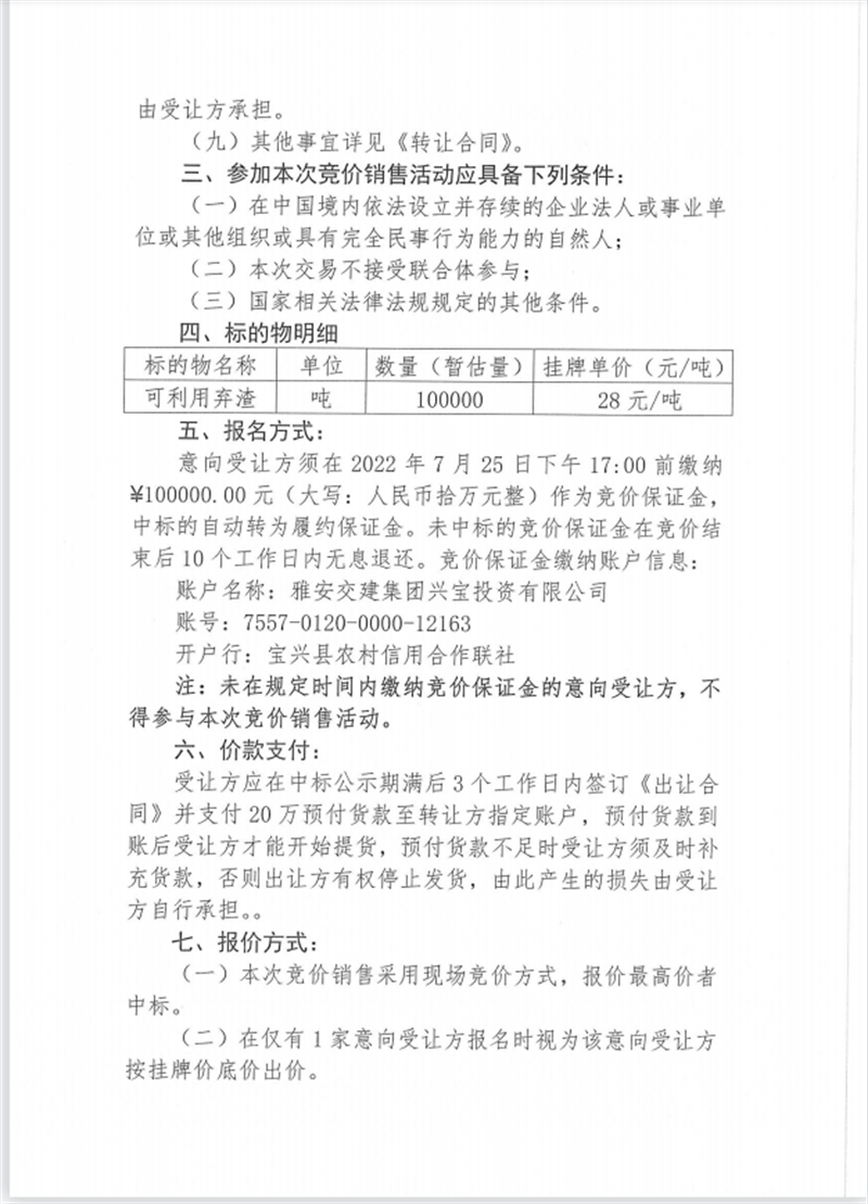 興寶公司寶興縣靈關(guān)鎮(zhèn)代碑寺土地整理項(xiàng)目10萬(wàn)噸可利用棄渣競(jìng)價(jià)銷(xiāo)售掛網(wǎng)公告掛網(wǎng)公告7.22(5萬(wàn)噸)