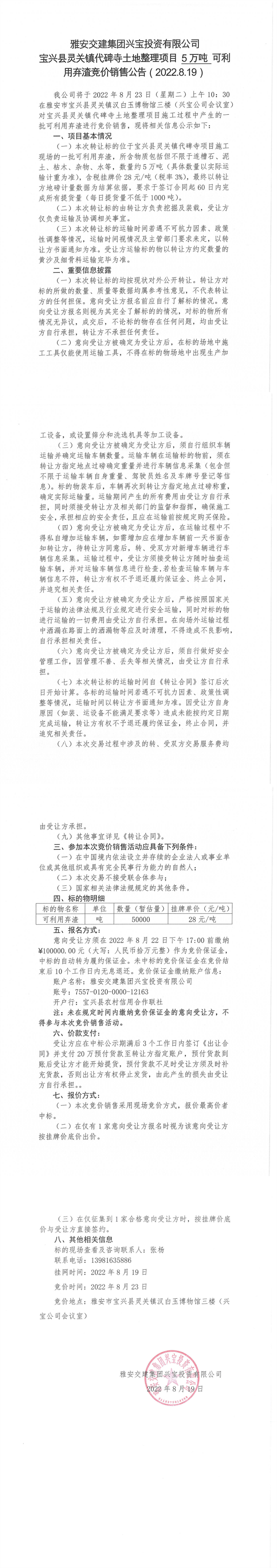 雅安交建集團(tuán)興寶投資有限公司靈關(guān)鎮(zhèn)代碑寺土地整理項目10萬噸可利用棄渣競價銷售公告(2022.8.19)(1)