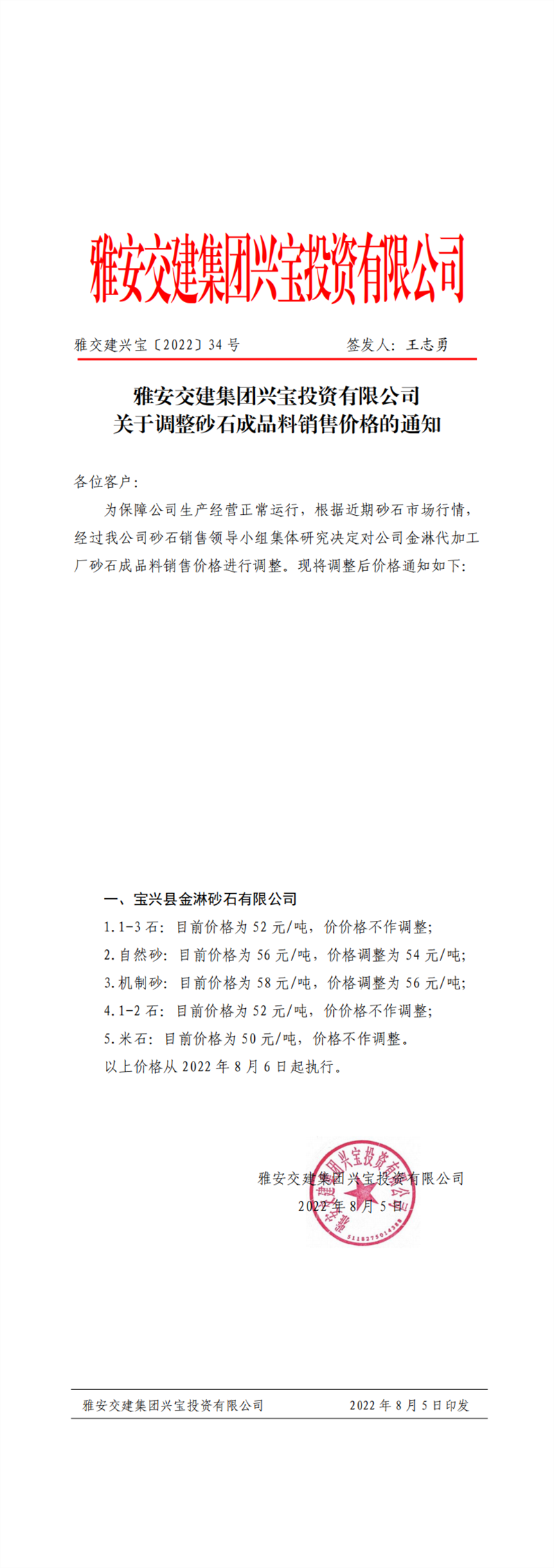雅交建興寶〔2022〕34號 關于調整砂石成品料銷售價格的通知