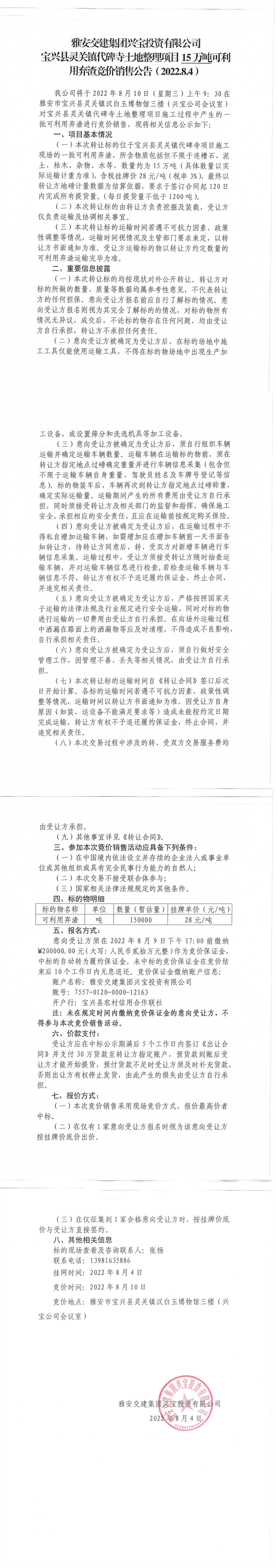 雅安交建集團(tuán)興寶投資有限公司靈關(guān)鎮(zhèn)代碑寺土地整理項(xiàng)目10萬噸可利用棄渣競價銷售公告(2022.8.4)