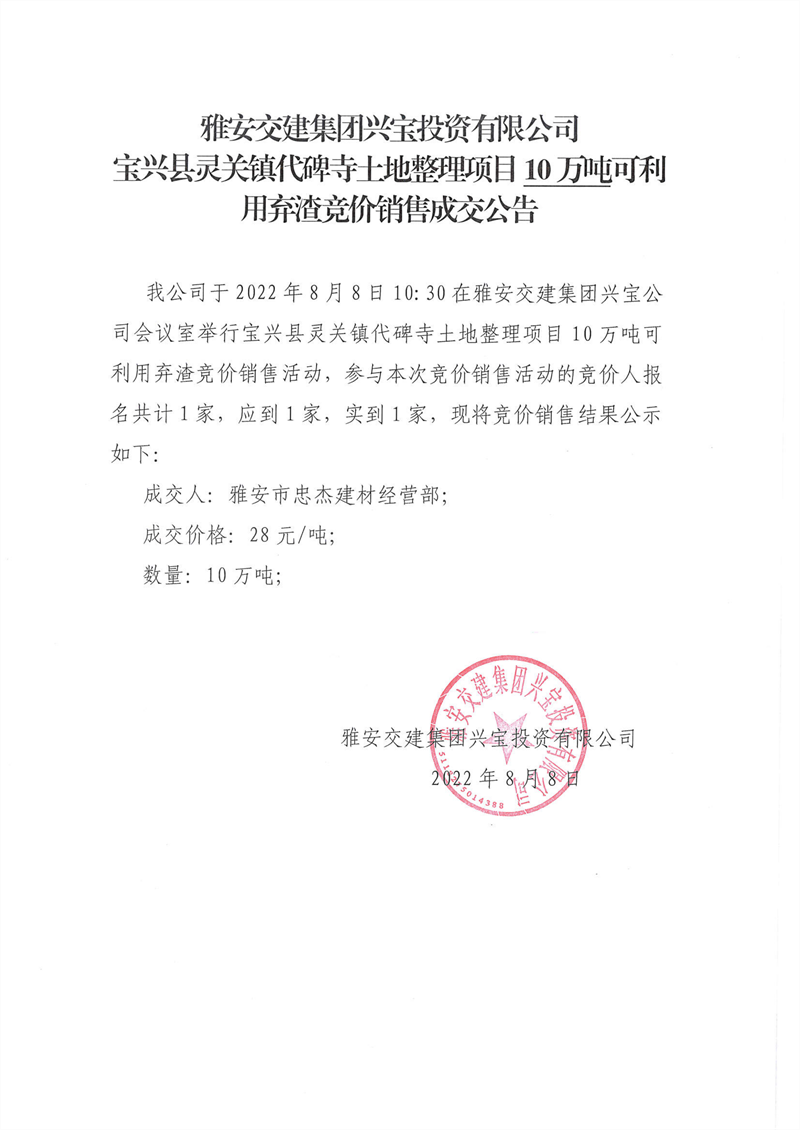 代碑寺土地整理項(xiàng)目10萬噸可利用棄渣競價銷售成交公告