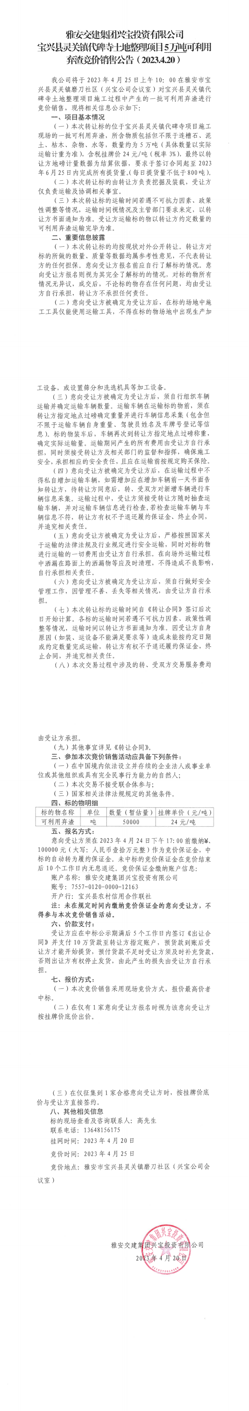 雅安交建集團(tuán)興寶投資有限公司靈關(guān)鎮(zhèn)代碑寺土地整理項(xiàng)目5萬(wàn)噸可利用棄渣競(jìng)價(jià)銷(xiāo)售公告(2023.4.20)