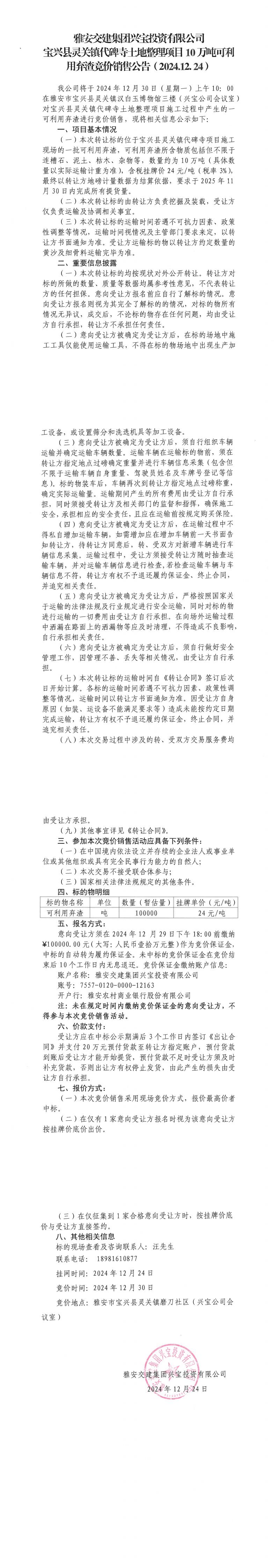 雅安交建集團興寶投資有限公司靈關(guān)鎮(zhèn)代碑寺土地整理項目10萬噸可利用棄渣競價銷售公告(2024.12.24)