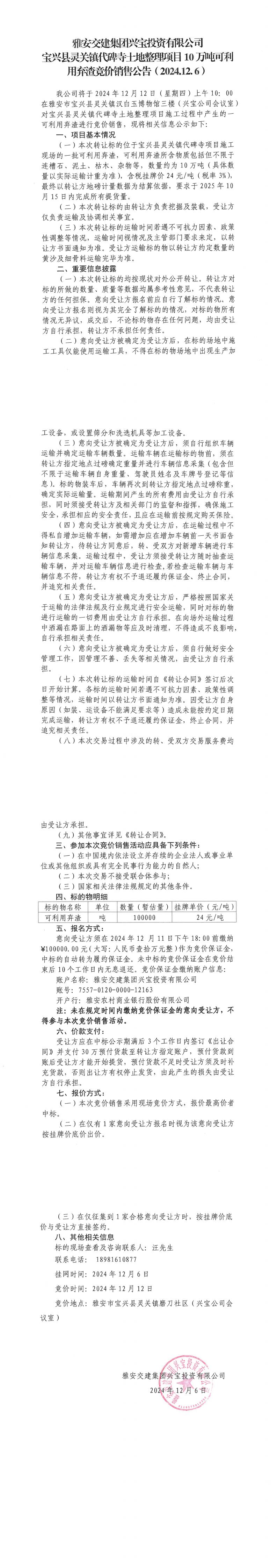 雅安交建集團(tuán)興寶投資有限公司靈關(guān)鎮(zhèn)代碑寺土地整理項(xiàng)目10萬(wàn)噸可利用棄渣競(jìng)價(jià)銷(xiāo)售公告(2024.12.06)