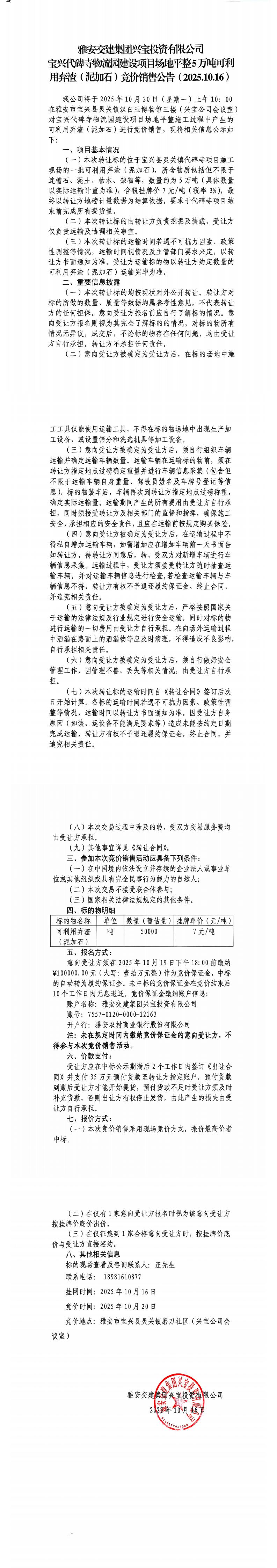 雅安交建集團(tuán)興寶投資有限公司寶興代碑寺物流園建設(shè)項目場地平整5萬噸可利用棄渣(精品)競價銷售公告(2025.10.16)